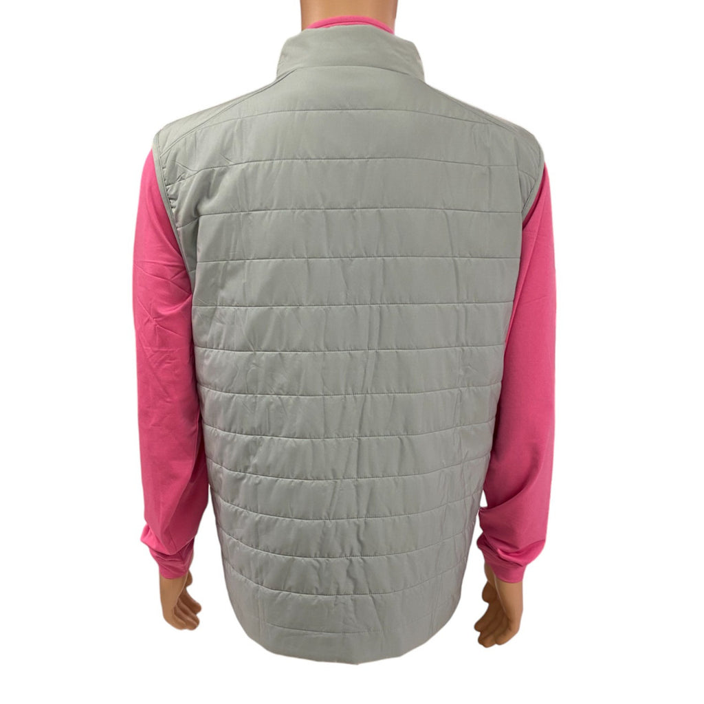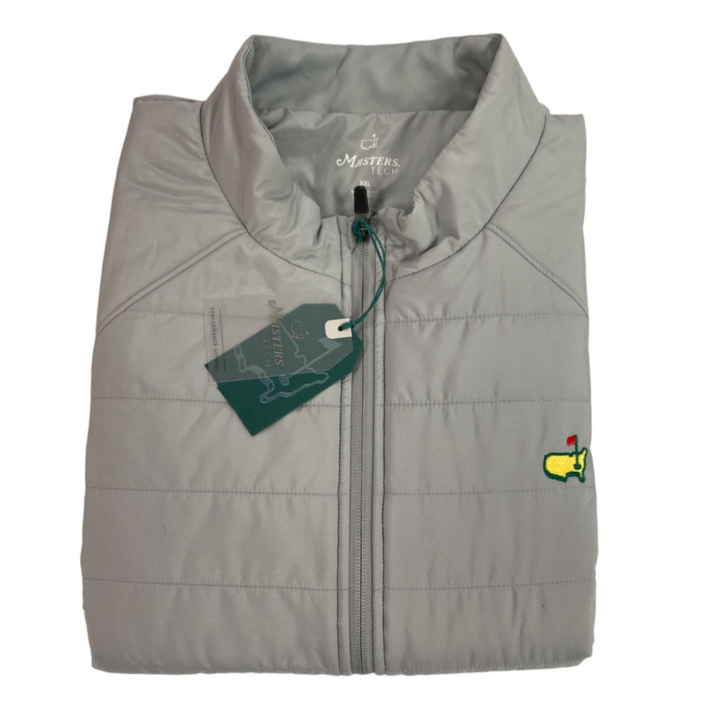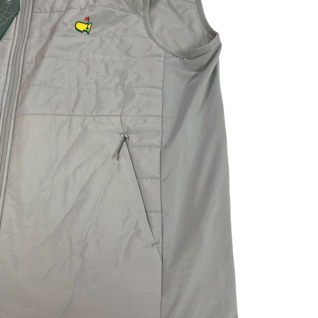 Look no further for the perfect lightweight layer for a brisk day on the course. With slightly filled channel insulation, this garment can keep you warm without the weight. The side panels of the vest allow for movement and stretch with a polyester/spandex fabrication while the shell of the vest is 100% polyester to make it windproof and water resistant. Invisible zippered pockets on each side keep the silhouette sleek and there is an inside pocket as well. The embroidered Masters emblem on the chest and Masters logo grippable zipper pull complete the look. Treat yourself today! **Picture shows the vest with a Peter Millar Crown Sport 1/4 Zip layer underneath - Not included.